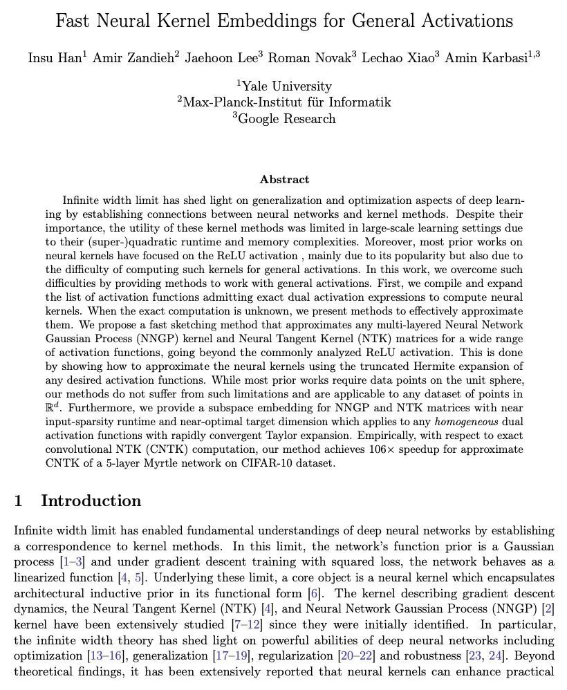通用激活的快速神经核嵌入。无限宽度限制通过建立神经网络和核方法之间的联系,阐明了深度学习的泛化和优化方面。尽管它们很重要,但由于其(超)二次方的运行时间和内存复杂性,这些核方法在大规模学习环境中的效用有限。此外,大多数先前关于神经核的工作都集中在ReLU激活上,这主要是由于它的流行,但也是由于为一般激活计算这种核的困难。本文通过提供处理一般激活的方法来克服这些困难。首先,本文汇编并扩展了允许精确双激活表达的激活函数列表,以计算神经核。当确切的计算结果未知时,本文提出了有效地近似它们的方法。提出了一种快速勾画的方法,可以近似任意多层神经网络高斯过程(NNGP)核和神经切线核(NT)矩阵,用于广泛的激活函数,超越了通常分析的ReLU激活。这是通过展示如何使用任何所需激活函数的截断的Hermite扩展来近似神经核来实现的。本文为NNGP和NTK矩阵提供了一个子空间嵌入,其运行时间接近输入稀疏度,目标维度接近最优,适用于任意具有快速收敛泰勒扩展的同质双激活函数。根据经验,与精确的卷积NTK(CNTK)计算相比,所提出方法在CIFAR-10数据集上对5层Myrtle网络的近似CNTK实现了106倍的加速。