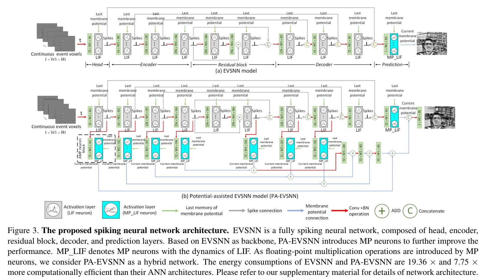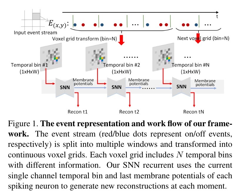 在本文中,我们提出了一种新的基于事件的视频重建框架,该框架基于完全尖峰神经网络 (EVSNN),该框架利用泄漏集成和发射 (LIF) 神经元和膜电位 (MP) 神经元。 为了更好地提取时间信息,我们提出了一种混合电位辅助框架(PA-EVSNN),使用尖峰神经元的膜电位。 本文的主要贡献总结如下: