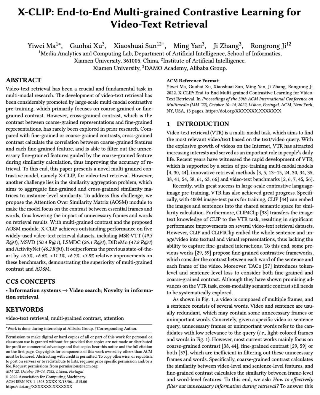 X-CLIP:面向视频文本检索的端到端多粒度对比学习。视频文本检索是多模态研究中一项重要的基本任务。大规模多模态对比预训练极大促进了视频文本检索的发展,这种训练主要集中在粗粒度或细粒度的对比上。然而,跨粒度对比,也就是粗粒度表示和细粒度表示之间的对比,在之前研究中很少被探讨过。与细粒度或粗粒度对比相比,跨粒度对比计算了粗粒度表示与每个细粒度表示之间的相关性,在相似性计算过程中能过滤掉由粗粒度特征引导的不必要的细粒度特征,从而提高检索的准确性。为此,本文提出一种新的多粒度对比模型X-CLIP,用于视频-文本检索。然而,另一个挑战在于相似性聚合问题,其目的是将细粒度和跨粒度的相似性矩阵聚合到实例级相似性。为了解决这一挑战,本文提出"相似度矩阵注意力"(AOSM)模块,使模型专注于必要的帧和词之间的对比,从而降低了不必要的帧和词对检索结果的影响。利用多粒度对比和提出的AOSM模块,X-CLIP在五个广泛使用的视频-文本检索数据集上取得了出色的性能,显示了多粒度对比和AOSM的优越性。