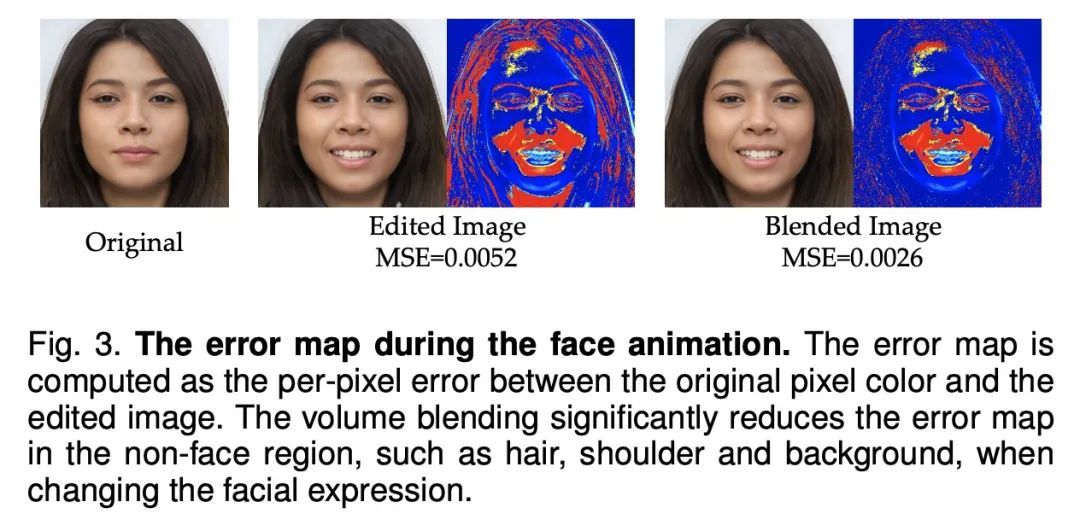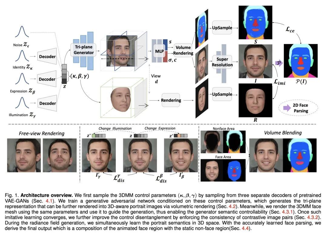 显式可控3D感知肖像生成。与传统昂贵的化身创建管线相比,当代的生成方法直接从照片中学习数据分布,现在的技术水平可产生高度逼真的图像。虽然大量工作试图扩展无条件生成模型,并实现某种程度的可控性,但要确保多视图的一致性仍然具有挑战性,特别是在大的姿态中。本文提出一种3D人像生成网络,能产生3D一致的人像,同时可根据关于姿态、身份、表情和照明的语义参数进行控制。生成网络使用神经场景表示来建立3D肖像模型,其生成由支持显式控制的参数化脸部模型引导。虽然可以通过对比具有部分不同属性的图像来进一步增强潜在的离散性,但在表情动画化时,在非面部区域,例如头发和背景,仍然存在明显的不一致。本文通过提出一个体混合策略来解决该问题,在该策略中,通过混合动态和静态辐射场形成一个复合输出,其中两部分是从联合学习的语义场中分割出来的。在大量的实验中,所提出方法优于之前的技术水平,当以自由视角观看时,在自然光下产生具有生动表情的逼真肖像。所提出方法还展示了对真实图像以及域外卡通脸的泛化能力,显示了在实际应用中的巨大前景。