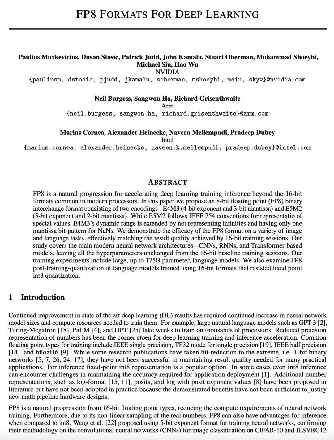 P Micikevicius, D Stosic, N Burgess, M Cornea, P Dubey, R Grisenthwaite, S Ha, A Heinecke, P Judd, J Kamalu, N Mellempudi, S Oberman, M Shoeybi, M Siu, H Wu