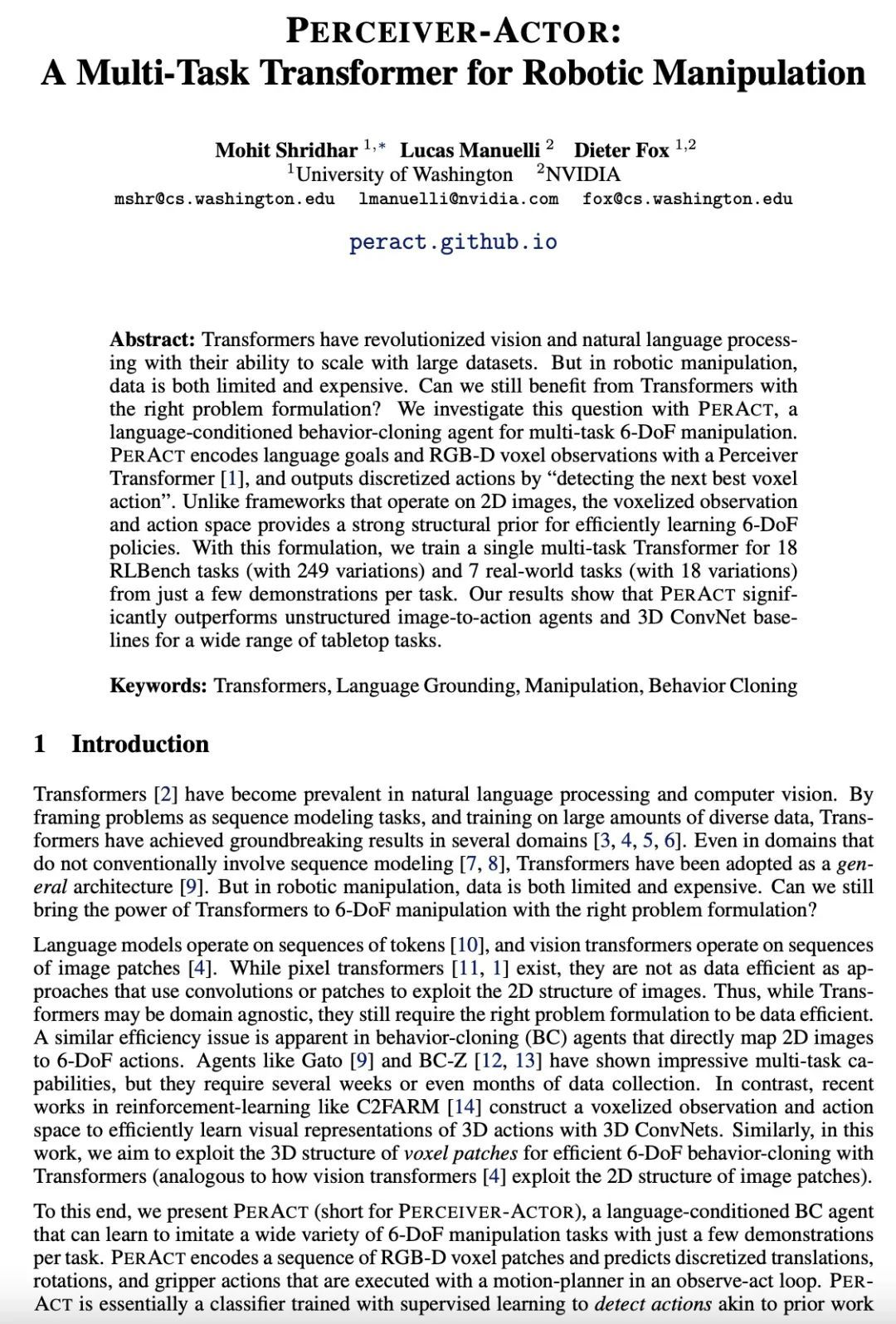 2、[RO] Perceiver-Actor: A Multi-Task Transformer for Robotic Manipulation