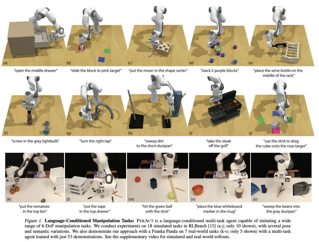 Perceiver-Actor:面向机器人操纵的多任务Transformer。Transformer以其对大型数据集的扩展能力彻底改变了视觉和自然语言处理。但在机器人操纵中,数据既有限又昂贵。通过正确的问题表述,我们还能从Transformer中获益吗?本文用PerAct研究这个问题,PerAct是一个以语言为条件的行为克隆智能体,用于多任务6-DoF操纵。PerAct用Perceiver Transformer对语言目标和RGB-D体素观察进行编码,并通过"检测下一最佳体素行动"输出离散的行动。与在2D图像上操作的框架不同,体素化的观察和行动空间为有效学习6-DoF策略提供了强大的结构性先验。通过这种方法,本文为18个RLBench任务(有249种变化)和7个真实世界的任务(有18种变化)训练了一个单一的多任务Transformer,每个任务只需要几个演示。实验结果表明,PerAct在广泛的桌面任务中明显优于非结构化图像-动作智能体和3D ConvNet基线。