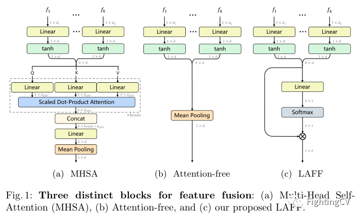 作者提出了 LAFF,一种轻量级的特征融合块,能够在早期和晚期进行融合。与 MHSA 相比,LAFF 更紧凑但更有效。它的注意力权重也可用于选择较少的特征,而检索性能大部分保持不变。