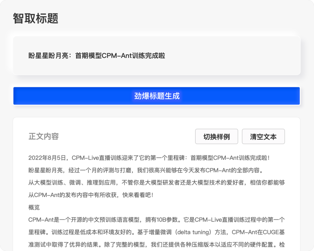 为了进一步验证模型的有效性并提供范例,我们在 CPM-Ant 基础上微调了一个劲爆标题生成器以展示模型能力。