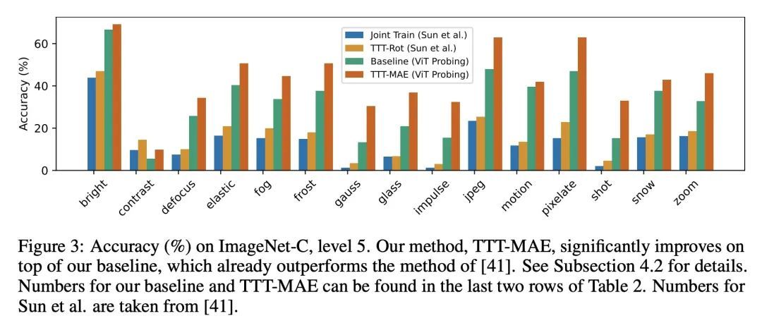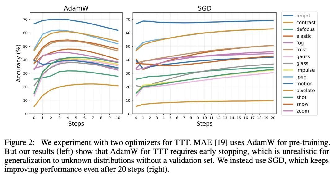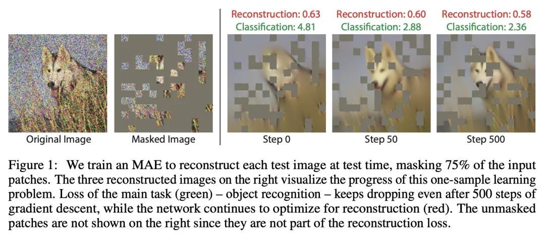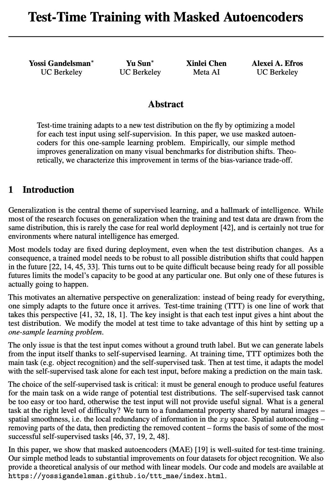 掩码自编码器的测试时训练。测试时训练通过用自监督对每个测试输入的模型进行优化,来自适应新的测试分布。本文使用掩码自编码器来解决这个单样本学习问题。从经验上看,所提出的简单方法在许多视觉基准上提高了分布迁移的泛化性。在理论上,本文用通过-方差权衡来描述此改进。
