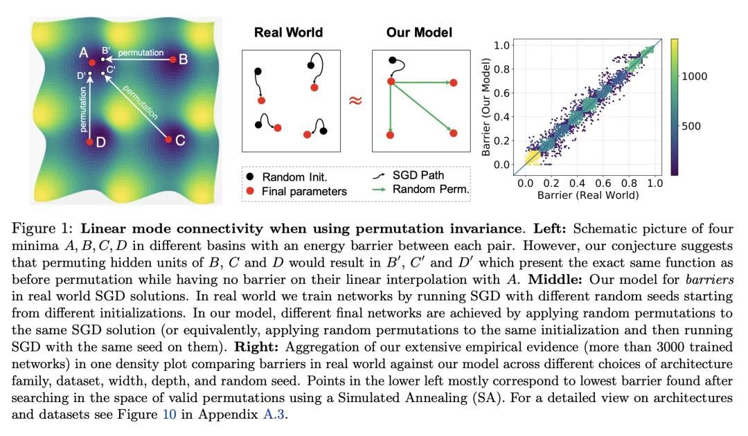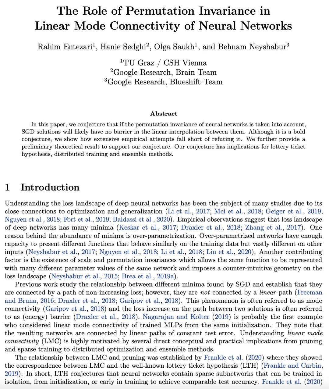 排列不变性在神经网络线性模式连接中的作用。本文猜想,如果考虑到神经网络的排列不变性,SGD求解方案在其之间的线性插值将可能没有障碍。虽然这是一个大胆的猜想,但本文展示了大量的经验性尝试是如何没有反驳它的。本文进一步提供一个初步的理论结果来支持该猜想。所提猜想对彩票假说、分布式训练和集成方法都有影响。
