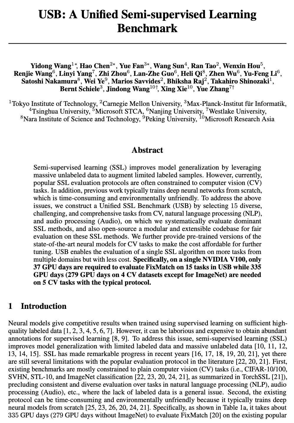 USB:统一半监督学习基准。半监督学习(SSL)通过利用大量未标记数据来增加有限标记样本,以提高模型的通用性。然而,目前,流行的半监督学习评估协议通常被限制在计算机视觉(CV)任务上。此外,之前的工作通常从头开始训练深度神经网络,很耗时,而且对环境不友好。为了解决上述问题,本文从计算机视觉、自然语言处理(NLP)和音频处理(Audio)中选择了15个不同的、具有挑战性的和全面的任务,构建了一个统一的SSL基准(USB),在这些任务上系统地评估了主流SSL方法,还开源了一个模块化和可扩展的代码库,以便对这些SSL方法进行公平评估。本文进一步为CV任务提供最先进的神经模型的预训练版本,以使进一步微调的成本可以承受。USB使单一的SSL算法可以在多个域的更多任务上进行评估,但成本更低。具体来说,在单个NVIDIA V100上,对USB中的15个任务进行FixMatch评估只需要37个GPU天,而使用典型协议对5个CV任务进行评估则需要335个GPU天(除ImageNet外的4个CV数据集需要279个GPU天)。