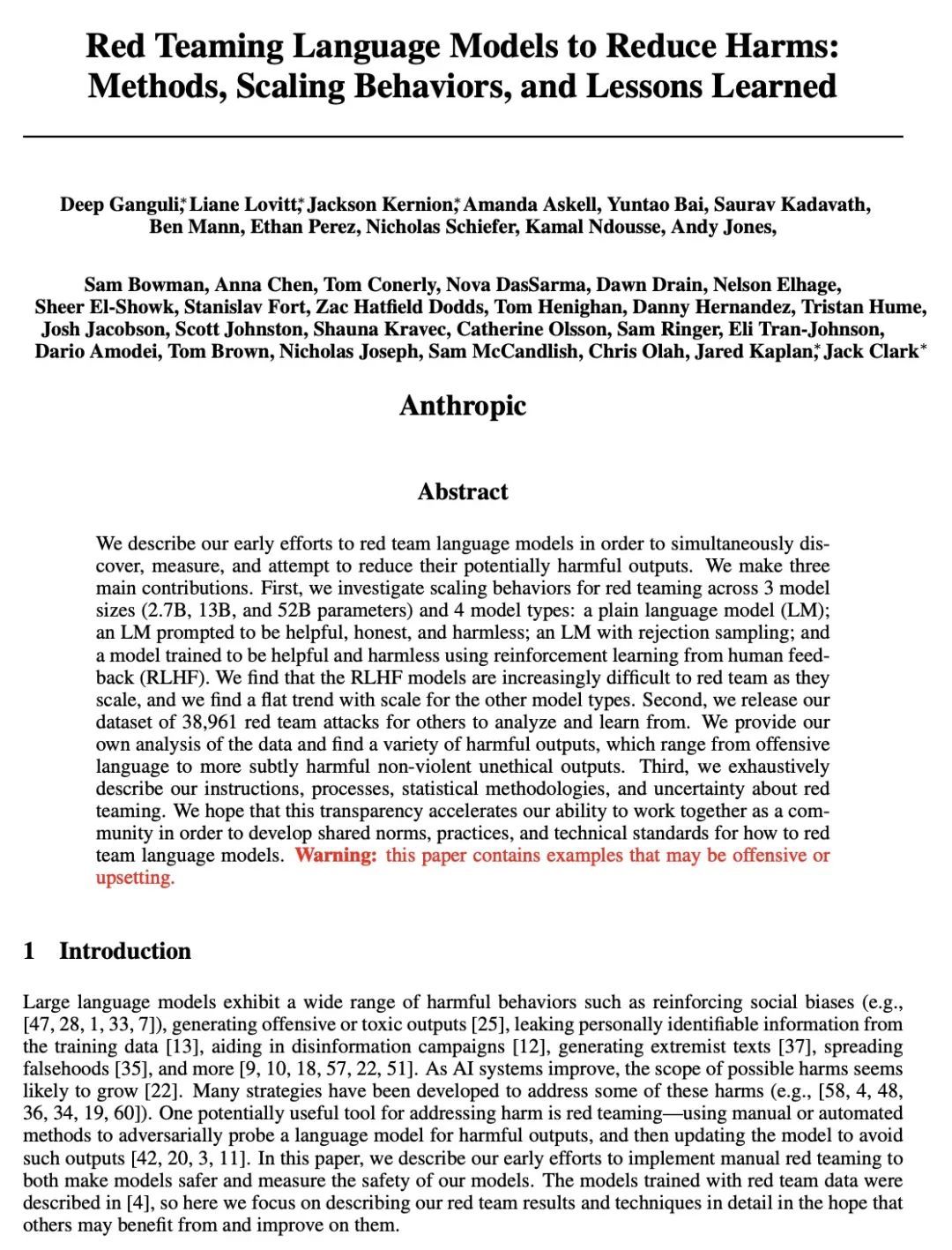 [CL] Red Teaming Language Models to Reduce Harms: Methods, Scaling Behaviors, and Lessons Learned