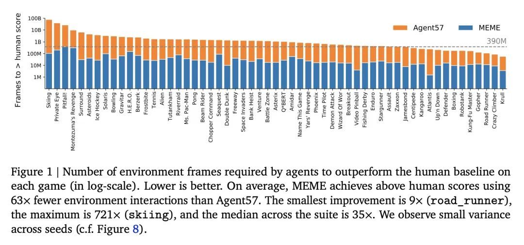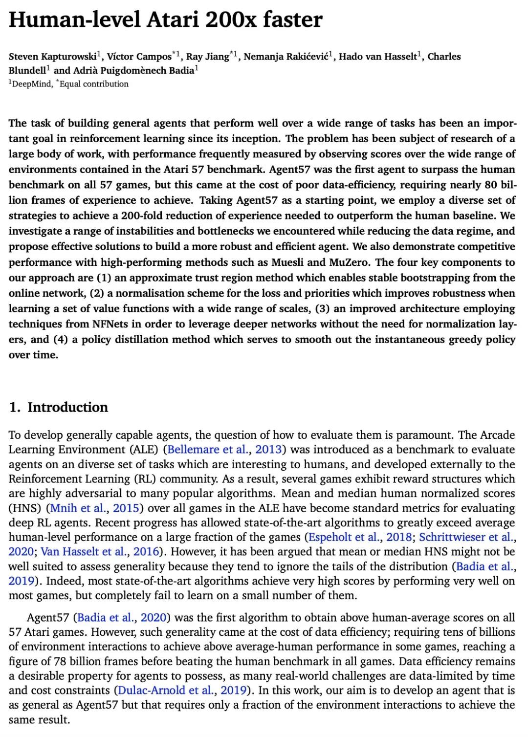 快200倍达到人类玩Atari水平。构建在各种任务中表现良好的通用智能体的任务,从一开始就是强化学习的一个重要目标。该问题已经成为大量工作的研究对象,其性能经常通过观察Atari 57基准中包含的各种环境的分数来衡量。Agent57是第一个在所有57个游戏中超过人类基准的智能体,但这是以数据效率低下为代价的,需要近800亿帧的经验才能实现。以Agent57为起点,本文采用一系列不同的策略,以实现超越人类基准,只需要200分之一的经验。本文研究了在减少数据系统时遇到的一系列不稳定因素和瓶颈,并提出了有效的解决方案,以建立一个更强大和高效的智能体。本文还展示了与Muesli和MuZero等高性能方法的竞争性能。所提出方法的四个关键部分是:(1)一种近似的信任区域方法,它能从在线网络中稳定地引导;(2)一种损失和优先权的归一化方案,它能在学习一组具有广泛规模的价值函数时提高鲁棒性;(3)一种改进架构,采用了NFNets的技术,以利用更深的网络,而不需要归一化层;(4)一种策略提炼方法,用于平滑瞬时贪婪策略的超时。