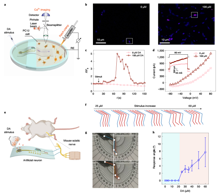而在人工神经元与生物体活体神经元交互界面,这种由化学神经递质介导的人工神经元,可以成功释放多巴胺,并能刺激 PC12 细胞打开离子通道。