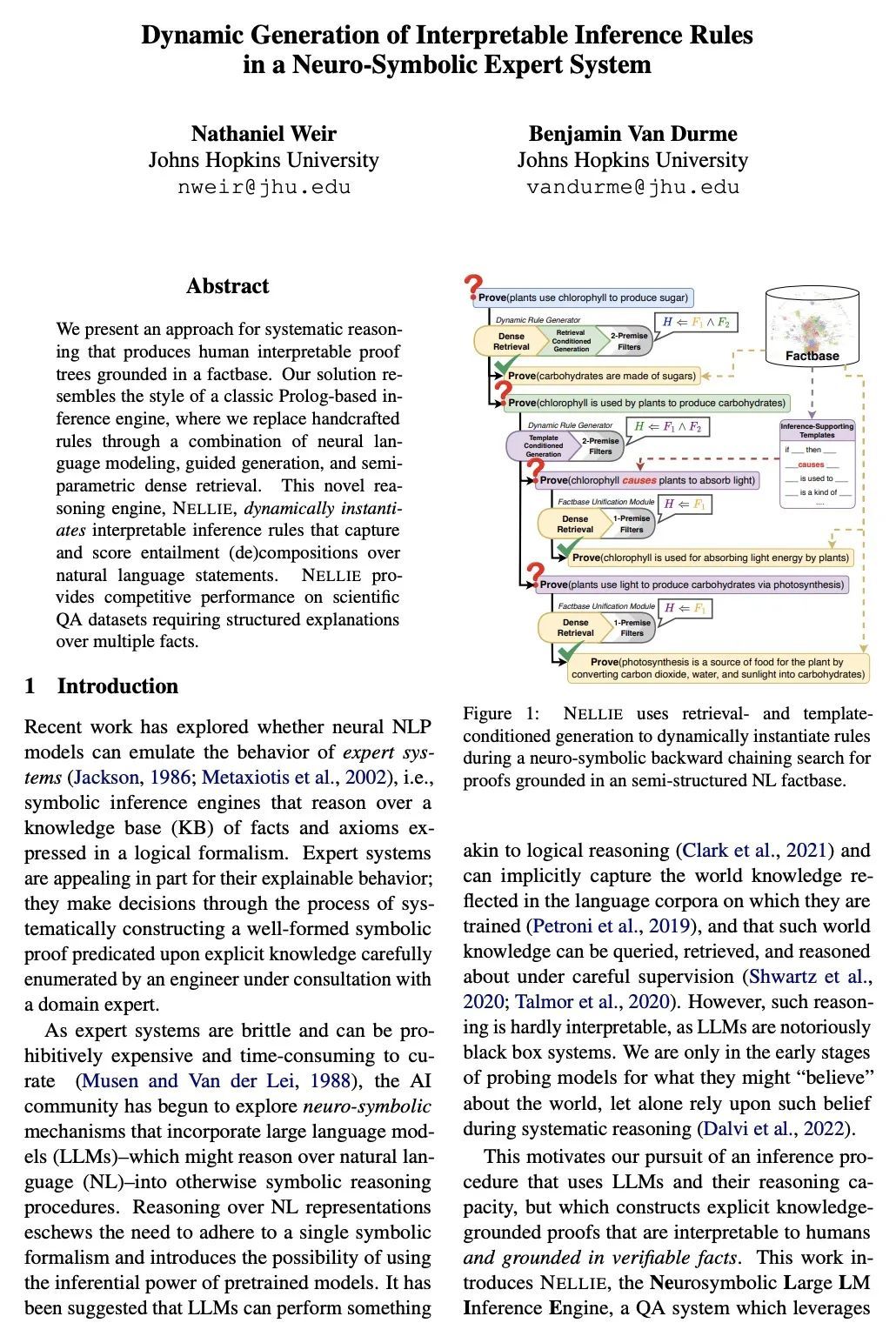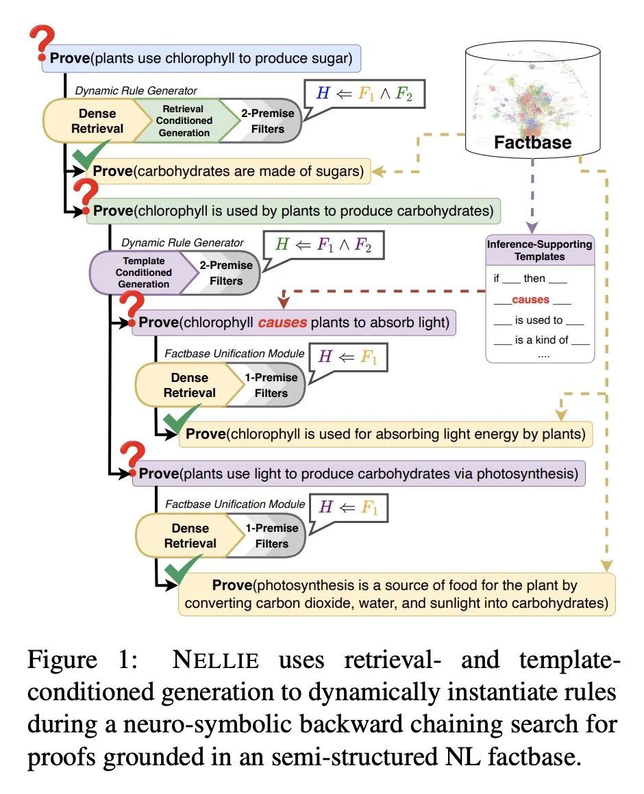 神经符号专家系统中可解释推理规则的动态生成。本文提出一种系统推理的方法,该方法在事实库的基础上产生人工可解释的证明树。所提出的解决方案类似于经典的基于Prolog的推理引擎的风格,通过神经语言建模、指导性生成和半参数密集检索的组合来取代手工制定的规则。新的推理引擎NELLIE动态地实例化了可解释的推理规则,这些规则捕捉并对自然语言语句的包含(非)组合进行评分。NELLIE在需要对多个事实进行结构化解释的科学QA数据集上提供了有竞争力的性能。