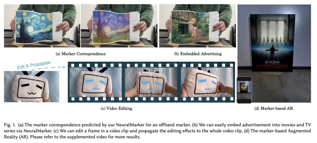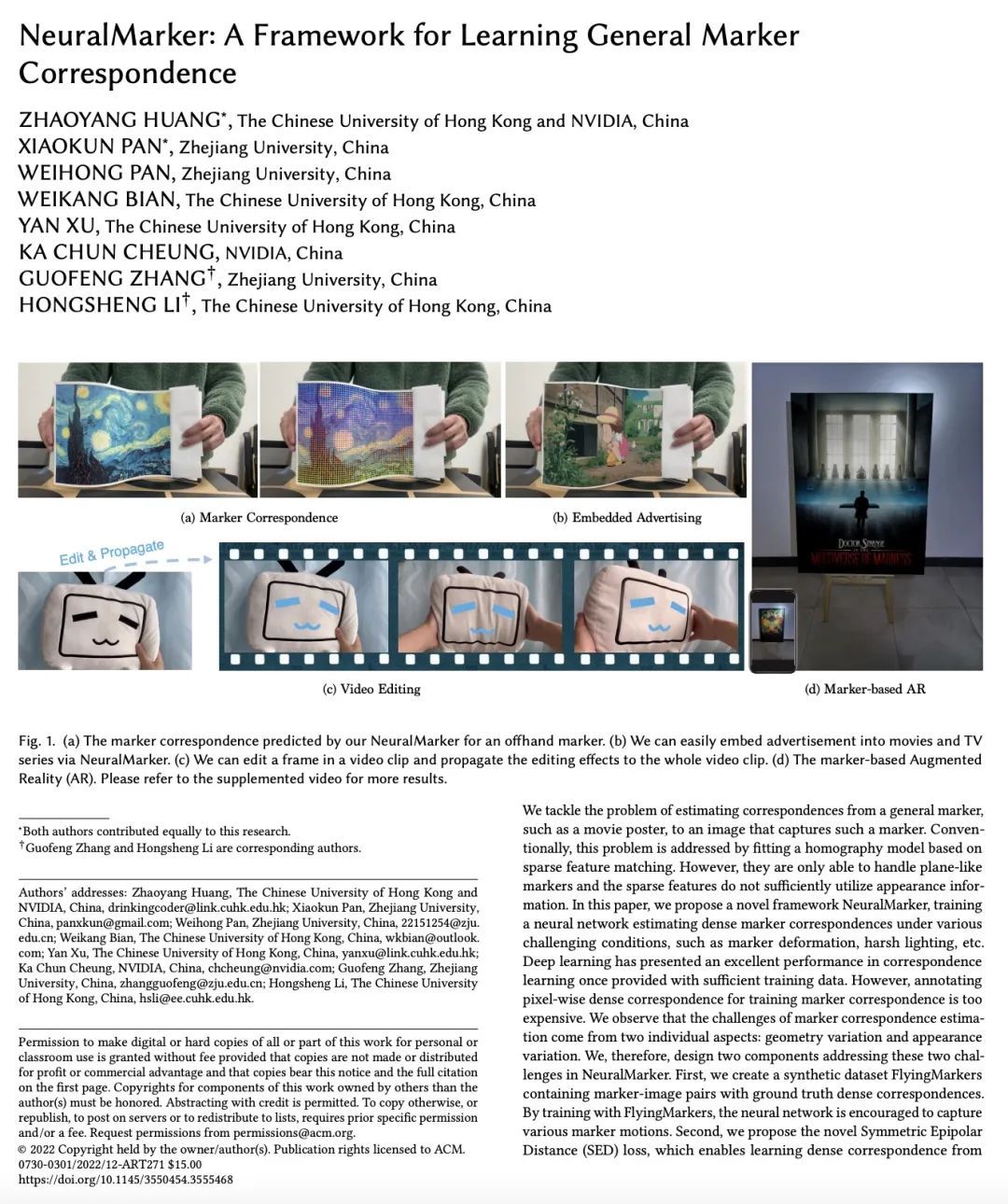 NeuralMarker: 通用标记物对应学习框架。本文要解决的问题,是估计通用标记物(如电影海报)与捕捉到这种标记物的图像间的对应关系。传统上,这个问题是通过拟合一个基于稀疏特征匹配的同源模型来解决的。然而,它们只能够处理类似平面的标记物,而且稀疏特征没有充分利用外观信息。本文提出一个新框架NeuralMarker,训练一个神经网络,在各种具有挑战性的条件下估计密集的标记物对应关系,如标记物变形、恶劣的光线等。此外,本文还提出一种新的标记对应关系评估方法,在真实的标记-图像对上进行标注,并创建了一个新的基准。实验表明,NeuralMarker明显优于之前的方法,并实现了新的有趣应用,包括增强现实(AR)和视频编辑。