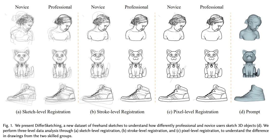 DifferSketching:专业/非专业自由手绘3D物体多视图草图数据集。为了解人们如何绘制3D物体,人们提出了多种草图数据集。然而,这些数据集通常规模较小,涵盖的对象或类别也较少。此外,这些数据集所包含的自由手绘大多来自专家用户,因此很难比较专家用户和新手用户的绘画,而这种比较对于为这两个用户群体提供更有效的基于草图的界面至关重要。这些观察促使我们去分析具有和不具有足够绘画技能的人在绘制3D物体时有什么不同。本文邀请了70位新手用户和38位专家用户绘制136个3D物体的草图,这些物体以362幅多视图的形式呈现。得到了一个由3620张自由手绘的多视图草图组成的新的数据集,这些草图在某些视图下被标记为相应的3D物体。所提数据集比现有的数据集要大一个数量级。本文从三个层面,即草图层面、笔画层面和像素层面,在空间和时间特征下,以及在创作者群体内部和之间,对所收集的数据进行分析,结果发现,专业人员和新手的绘画在笔触层面上表现出明显的差异,包括内在的和外在的。在两个应用中证明了该数据集的有用性:(i)自由手绘风格的草图合成,以及(ii)将其作为基于草图的3D重建的潜在基准。