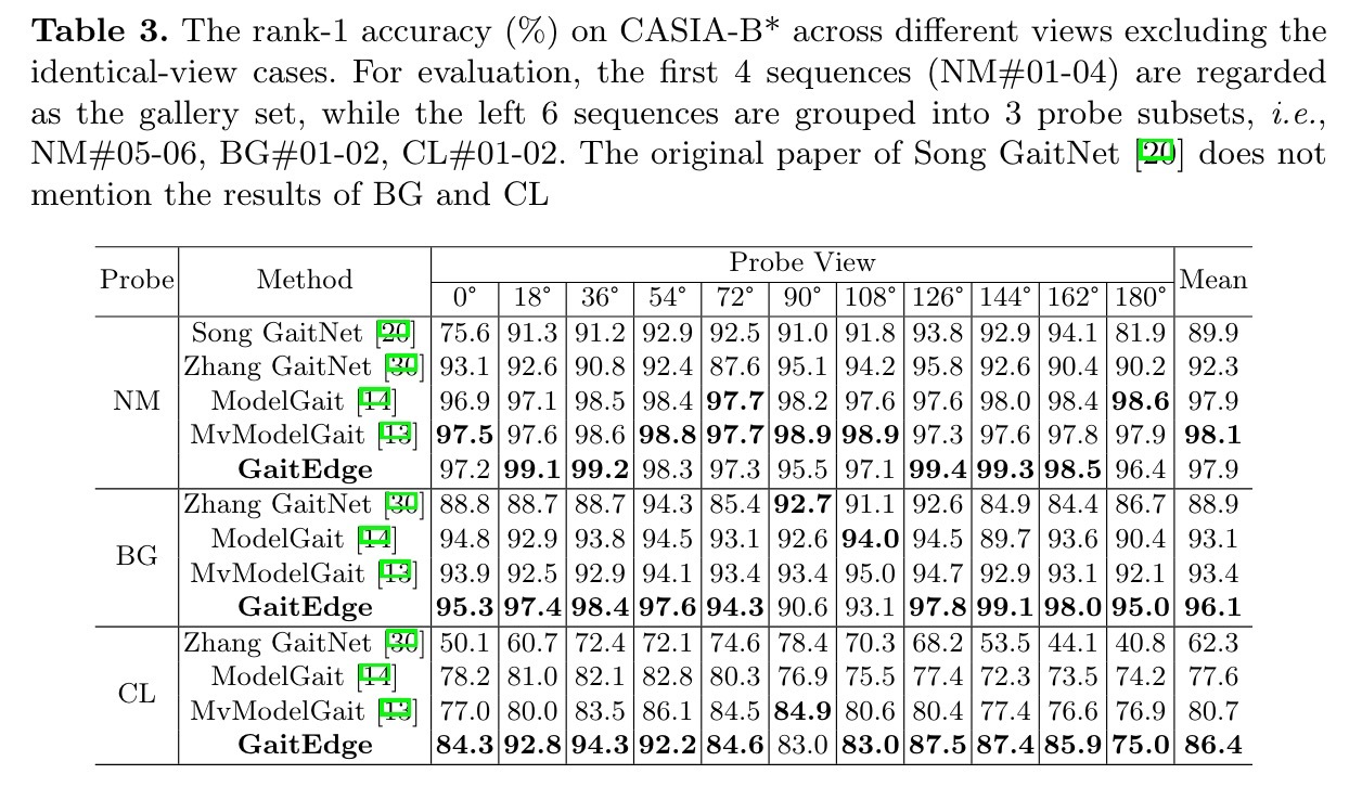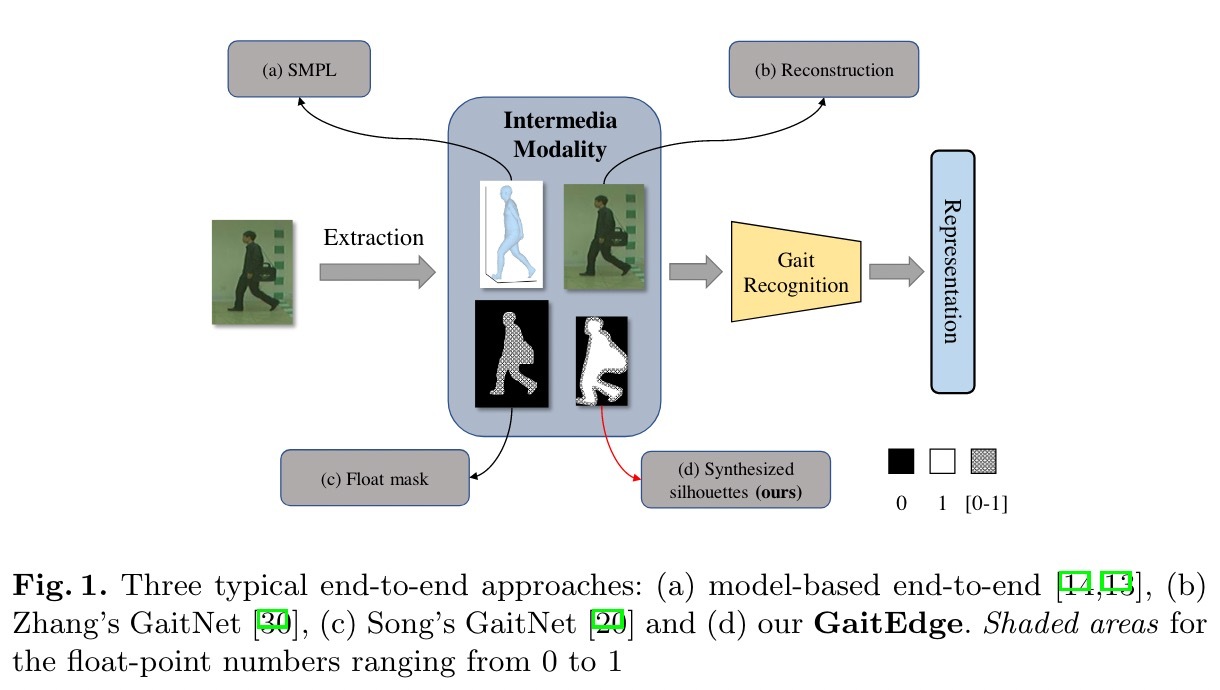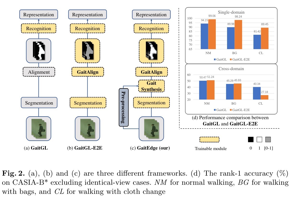 步态是最有前途的远距离识别个体的生物特征之一。虽然以往的步态特征提取方法主要集中在轮廓的识别上,但有几种直接从RGB图像中提取步态特征的端到端方法表现得更好。然而,我们证明了这些端到端的方法不可避免地会受到与步态无关的噪声的影响,即低级纹理和彩色信息。实验上,我们设计了跨域评估来支持这一观点。本文提出了一种新的端到端框架GaitEdge,该框架能够有效地屏蔽步态无关信息,释放端到端的训练潜力。具体来说,GaitEdge合成行人分割网络的输出,然后将其馈送给后续的识别网络,其中合成的轮廓由可训练的身体边缘和固定的内部组成,以限制识别网络接收的信息。此外,用于对齐轮廓的GaitAlign嵌入到GaitEdge中,而不损失可微性。在CASIA-B和我们新建的TTG-200上的实验结果表明,GaitEdge的性能明显优于以前的方法,提供了一个更实用的端到端范例。