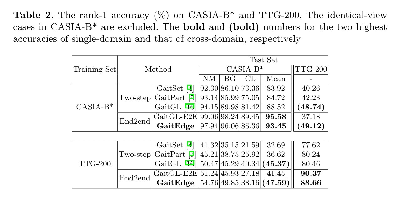 综上所述,我们做出了以下三个主要贡献:(1)我们指出了步态无关噪声被混合到最终步态表示中的问题,并引入了跨域测试来验证RGB信息噪声的泄漏。此外,由于缺乏一个提供RGB视频的步态数据集,我们收集了一万个步态(TTG-200),其大小约等于流行的CASIA-B[26]。(2)我们提出了一个简洁而引人注目的端到端步态识别框架GaitEdge。在CASIA-B和TTG-200上的实验表明,GaitEdge达到了一个新的最先进的性能,我们宣布,GaitEdge可以有效地防止无关的RGBinformed噪声。(3)我们提出了一个基于轮廓的端到端步态识别模块GaitAlign,它可以看作是尺寸归一化的可微版本[9]。