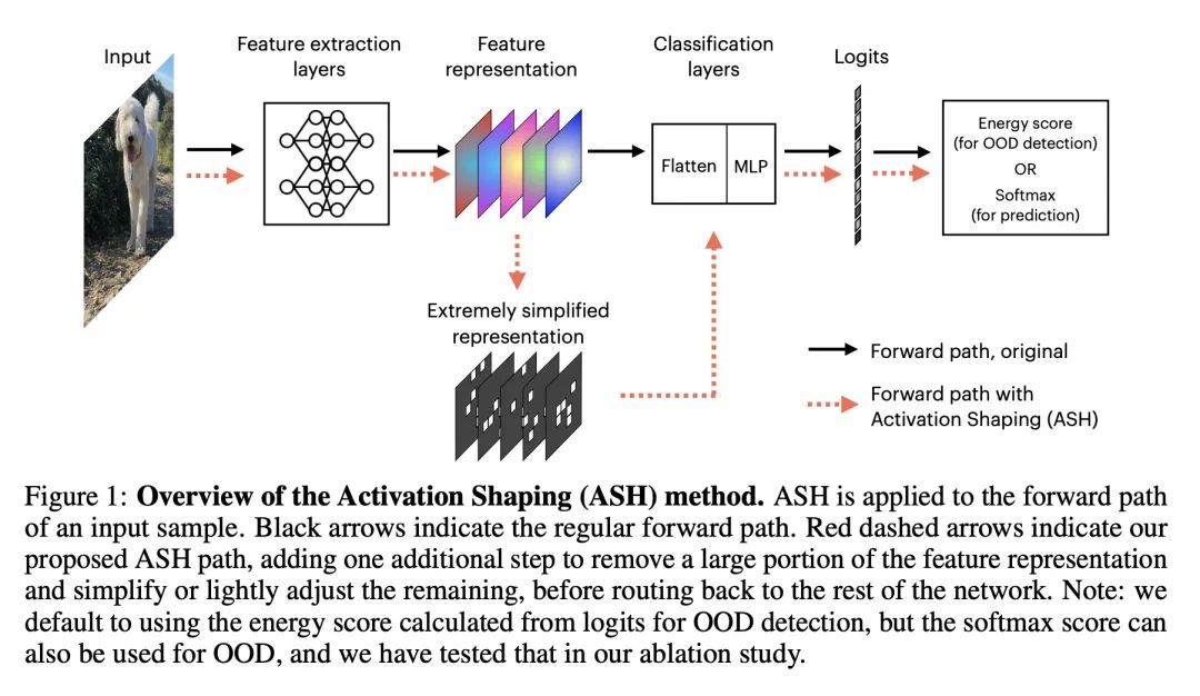 面向分布外检测的极其简单的激活整形。机器学习模型的训练和部署是分开的,这意味着在训练中并不能预见到部署中遇到的所有情况,因此仅仅依靠训练中的进展是有局限的。分布外(OOD)检测是一个重要的领域,它对模型处理未见情况的能力进行了压力测试。模型是否知道他们不知道的情况?现有的OOD检测方法要么产生额外的训练步骤,要么产生额外的数据,要么对训练好的网络进行非实质性的修改。相比之下,本文提出一种极其简单的、事后的、即时的激活整形方法,即ASH,其中一个样本的大部分(例如90%)在后期层的激活被移除,其余的(例如10%)被简化或轻度调整。整形是在推理时应用的,不需要从训练数据中计算任何统计数据。实验表明,这种简单的处理方法增强了分布内和分布外样本的区分,从而允许在ImageNet上进行最先进的OOD检测,并且不会明显地恶化分布内的精度。