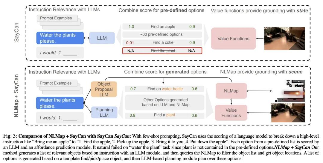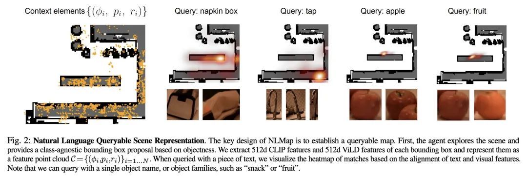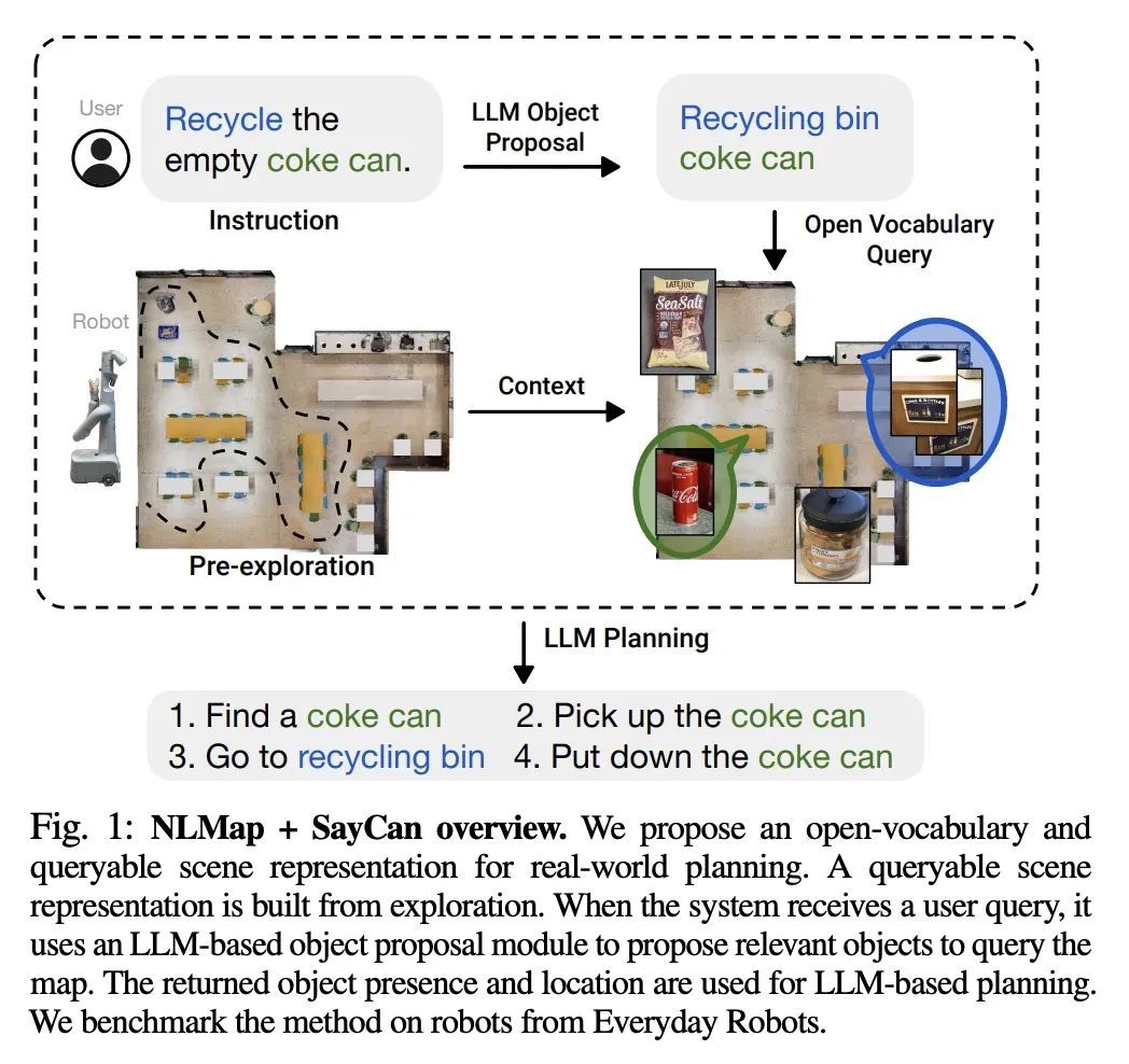 面向现实世界规划的开放词表可查询场景表示。大型语言模型(LLM)已经从人工指令中解锁了任务规划的新能力。然而,之前将LLM应用于现实世界的机器人任务的尝试由于缺乏周围场景的基础而受到限制。本文开发了NLMap,一个开放词汇和可查询的场景表示法来解决这个问题。NLMap作为一个框架,用来收集和整合上下文信息到LLM规划器中,使它们能够在生成一个有上下文条件的规划之前看到并查询场景中的可用对象。NLMap首先用视觉语言模型(VLM)建立了一个自然语言可查询的场景表示。一个基于LLM的对象建议模块对指令进行解析,并提出所涉及的对象,以查询场景表示中的对象可用性和位置。然后,LLM规划器利用这些关于场景的信息进行规划。NLMap允许机器人在没有固定对象清单或可执行选项的情况下进行操作,从而实现了之前的方法无法实现的真正的机器人操作。
