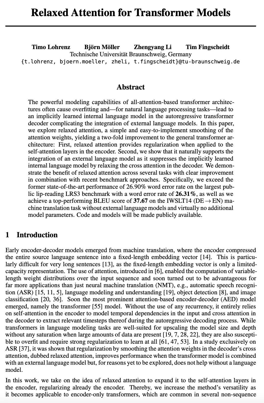 Transformer模型松弛注意力。基于全注意力的Transformer架构的强大建模能力往往会导致过拟合,并且对于自然语言处理任务来说,会导致自回归Transformer解码器中隐含的内部语言模型的学习,从而使外部语言模型的整合变得复杂。本文探讨了松弛注意力,一种简单易行的注意力权重平滑,对一般的变换器Transformer结构产生了双重的改进。首先,松弛注意力在应用于编码器中的自注意力层时提供了正则化。其次,它自然支持外部语言模型的整合,因为它通过松弛解码器中的交叉注意力来抑制隐性学习的内部语言模型。本文证明了松弛注意力在几个任务中的好处,与最近的基准方法相结合,有明显的改善。具体来说,在最大的开放唇读LRS3基准上,以26.31%的单词错误率超过了以前最先进的性能,在没有外部语言模型和几乎没有额外模型参数的情况下,在IWSLT14(DE→EN)机器翻译任务上取得了37.67分的最高性能的BLEU分数。