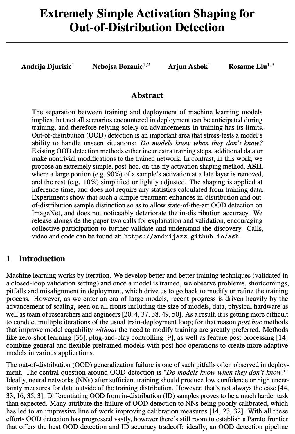 The separation between training and deployment of machine learning models implies that not all scenarios encountered in deployment can be anticipated during training, and therefore relying solely on advancements in training has its limits. Out-of-distribution (OOD) detection is an important area that stress-tests a model’s ability to handle unseen situations: Do models know when they don’t know? Existing OOD detection methods either incur extra training steps, additional data or make nontrivial modifications to the trained network. In contrast, in this work, we propose an extremely simple, post-hoc, on-the-fly activation shaping method, ASH, where a large portion (e.g. 90%) of a sample’s activation at a late layer is removed, and the rest (e.g. 10%) simplified or lightly adjusted. The shaping is applied at inference time, and does not require any statistics calculated from training data. Experiments show that such a simple treatment enhances in-distribution and outof-distribution sample distinction so as to allow state-of-the-art OOD detection on ImageNet, and does not noticeably deteriorate the in-distribution accuracy. We release alongside the paper two calls for explanation and validation, encouraging collective participation to further validate and understand the discovery. Calls, video and code can be found at: https://andrijazz.github.io/ash.