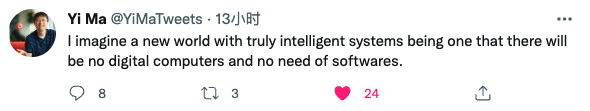 我确实相信智能的计算和科学研究将能够很快融合。Friston教授提出了一个很好的观点,任何聪明的东西都应该具有自我好奇的关键特征。对于学习分布/相关性,我使用术语“自我批评”,对于因果关系,Judea Pearl 称之为“自我询问”,这是自主的关键。我想象一个拥有真正智能系统的新世界将是一个没有数字计算机也不需要软件的世界。