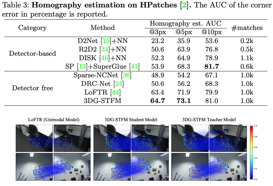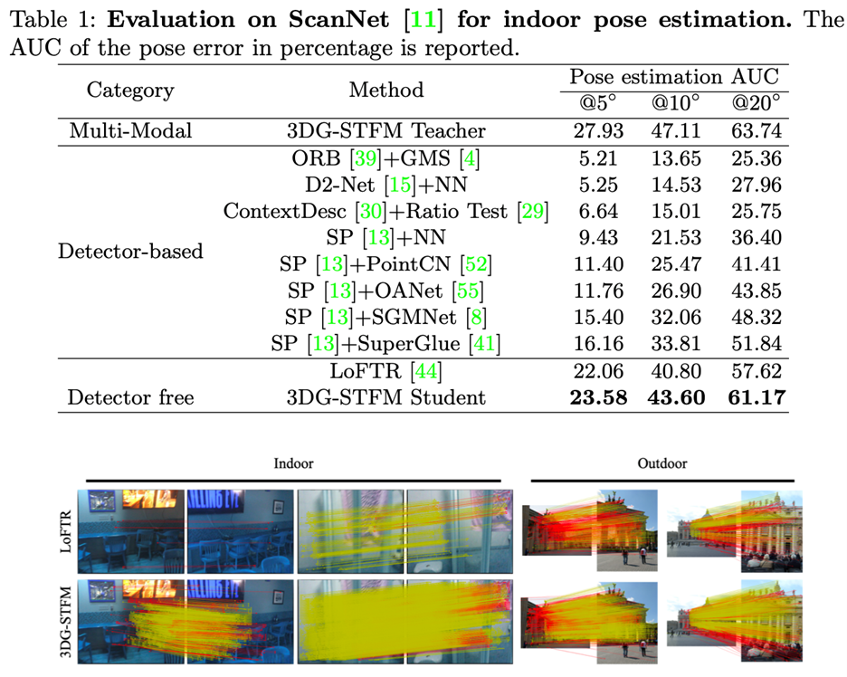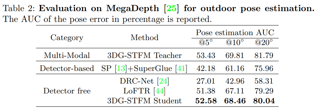 由于发布的DRC网络是在MegaDepth上训练的,而LoFTR被证明具有更好的性能,仅将LoFTR视为最先进的网络进行比较。图3.1.1表1中的结果表明,3GD-STFM模型优于所有单一模式竞争对手。对于无检测器方法,学生模型在 10∘ 阈值的结果比LoFTR要优秀近百分之三。