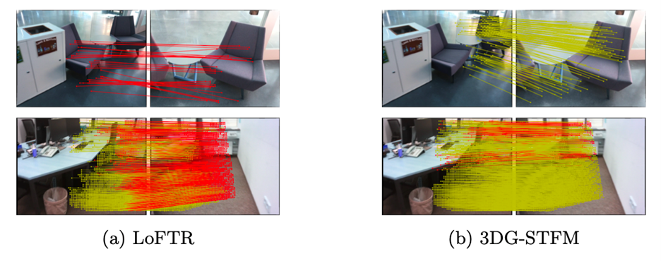 图 1.1 稠密局部特征匹配方法LoFTR与所提方法3DG-STFM的比较。该示例表明,3DG-STFM方法可以在具有重复模式和低纹理区域的具有挑战性的场景下找到正确的对应关系。红色表示极线误差超过5×10^(-4)(在标准化图像坐标中)。
