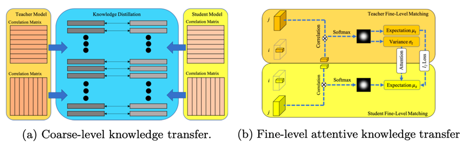 如图3.3.1(a),相关矩阵被分解为多个独立的分布,学生模型间以这种形式相互查询学习。图3.3.2(b) 描述了精细层的信息传递。选择精细级别要素的一个中心点,并与其他要素图的所有点关联,以生成热图分布。教师部门热图的期望和方差可以用于用于精细层次的知识转移。
