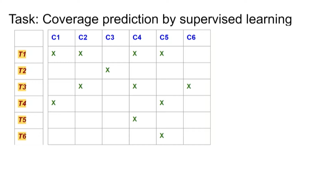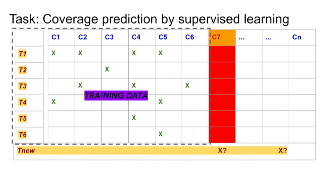 后来我们发现,可以把这个问题转化为一个监督学习问题。如果之前进行了一系列测试,并知道这些测试覆盖哪些测试点,就可以将这些数据用作监督学习中的训练数据。