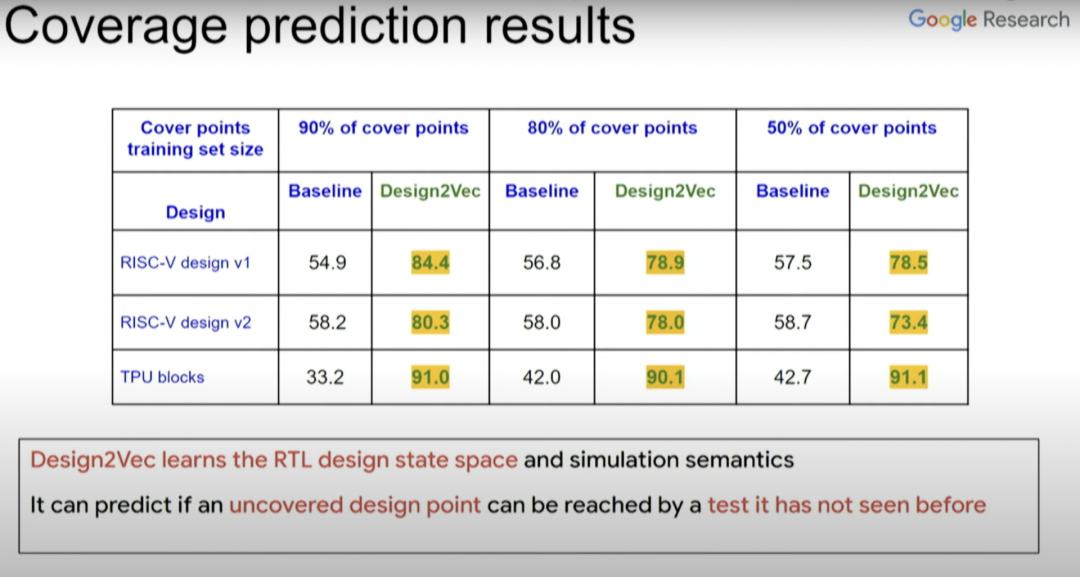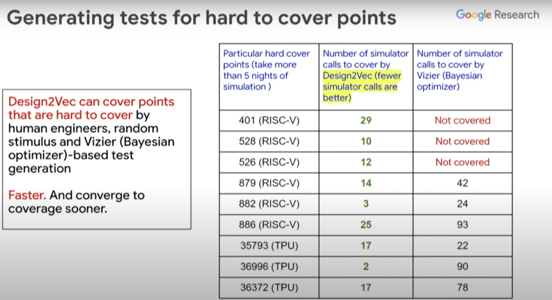 上图右边这一列是贝叶斯优化器覆盖的不同测试点、覆盖点所需的模拟器调用数(simulator calls),中间一列是使用Design2Vec所需的模拟器调用数。从中可以看到,为覆盖这些有挑战性的覆盖点,Design2Vec生成的测试要少于贝叶斯优化器。所以Design2Vec非常好,相比之下它更快,能聚焦覆盖范围,还能节省在运行计算模拟器(本身很昂贵)上的开销。