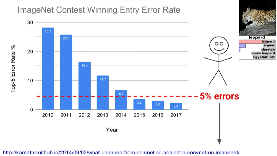 当时的斯坦福大学研究生Andrej Karpathy正在帮助运营ImageNet比赛,他想知道如果人工识别这项艰难的任务,错误率会是多少。在上千个类别中有40种狗,你必须能够看着一张照片说:“哦,那是一只罗威纳犬,不是一只大力金刚犬,或者其他品种的狗。” 经过一百个小时的训练,他将错误率降到了5%。