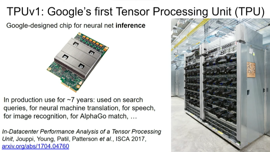 TPU v1是我们第一个针对推理的产品,当你拥有经过训练的模型,并且只想获得已投入生产使用的模型的预测结果,那它就很适合,它已经被用于神经机器翻译的搜索查询、AlphaGo比赛等应用中。