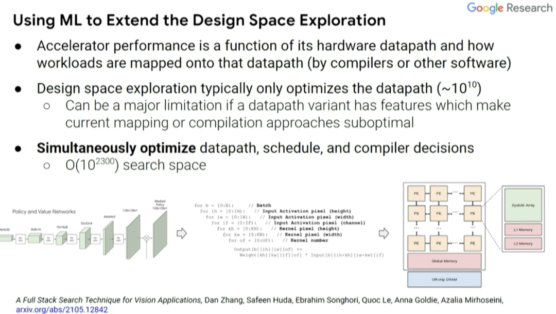 实际上,我们可以使用机器学习来探索设计空间。有两个因素影响加速器性能,一是设计中内置的硬件数据通道,二是工作负载如何通过编译器而不是更高级别的软件映射到该数据通道。通常,设计空间探索实际上只考虑当前编译器优化的数据通道,而不是协同设计的编译器优化和优化数据通道时可能会做的事。