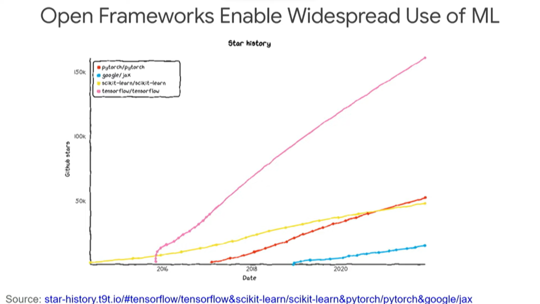 大约在2015年11月,我们开源了TensorFlow以及供Google内部使用的工具。TensorFlow对世界产生了相当大的影响,它已经被下载了大约5000万次,当然也出现了很多其他框架,比如JAX、PyTorch等等。