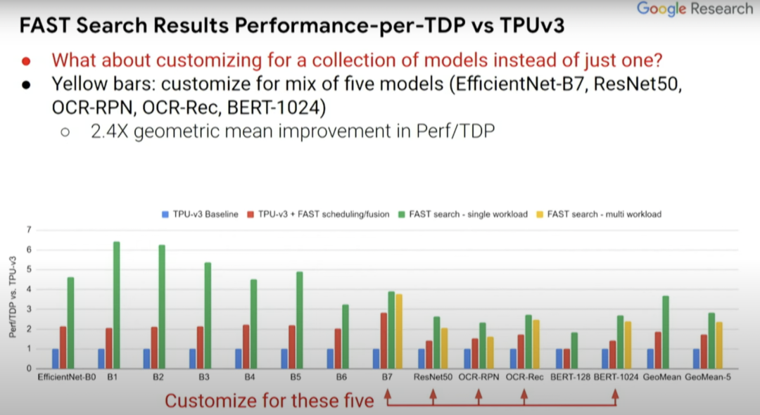 上图的黄条代表为五种不同模型设计的定制化芯片,而我们想要一个能同时运行这五种模型(红色箭头所指)的芯片,然后就能看出其性能能达到何种程度。可喜的是,从中可以看到,黄条(单一负载)并不比绿条(多负载)的性能低多少。所以你实际上可以得到一个非常适合这五种模型的加速器设计,这就好比你对其中任何一个模型都进行了优化。它的效果可能不是最好的,但已经很不错了。