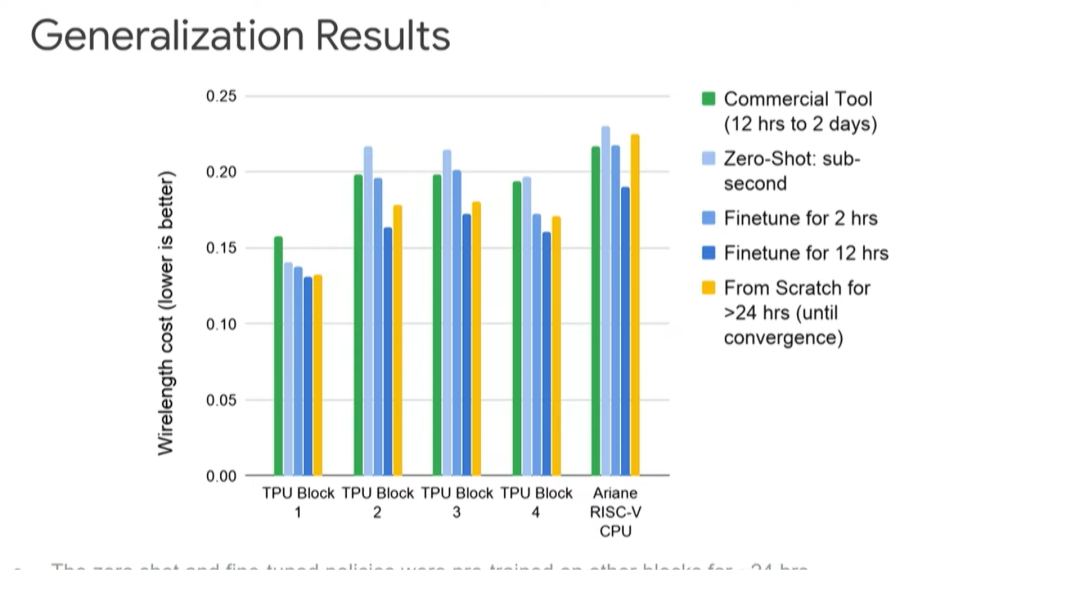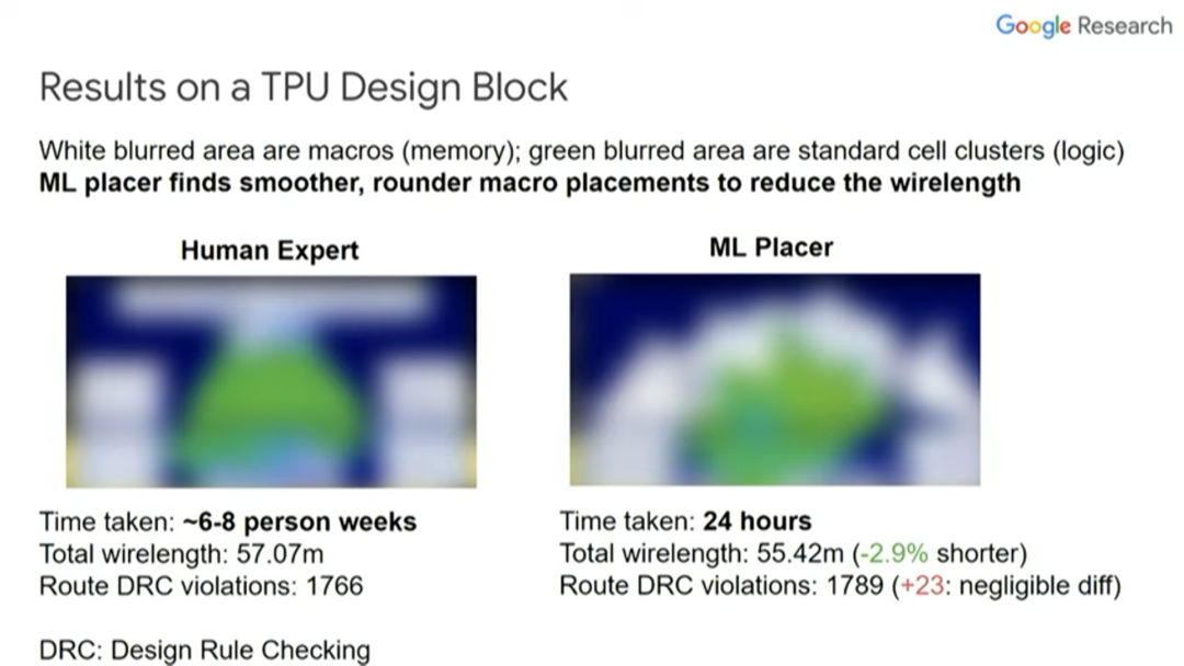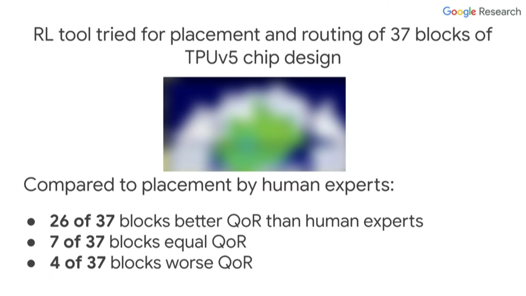 我们利用强化学习工具针对TPU v5芯片的37个设计块进行了布局与布线。其中,26个设计块的布局与布线质量优于人类专家,7个设计块的质量与人类专家相近,4个设计块的质量不如人类专家。目前我们已经把这个强化学习工具投入到芯片设计流程中了。