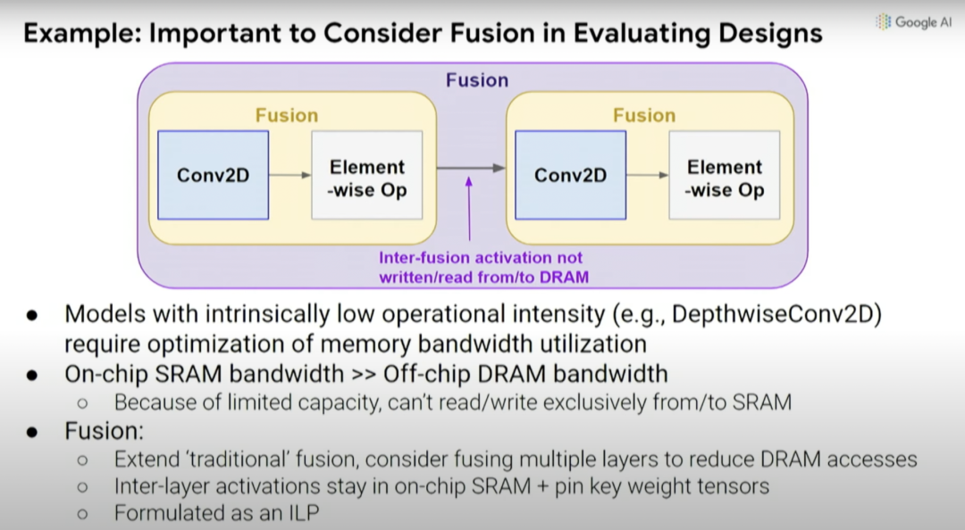 因此,我们能否同时优化数据通道、调度(schedule)和一些编译器决策,并创建一个搜索空间,探索出你希望做出的共同设计的决策。这是一种覆盖计算和内存瓶颈的自动搜索技术,探索不同操作之间的数据通道映射和融合。通常,你希望能够将事物融合在一起,避免内存传输的每次内存负载中执行更多操作。