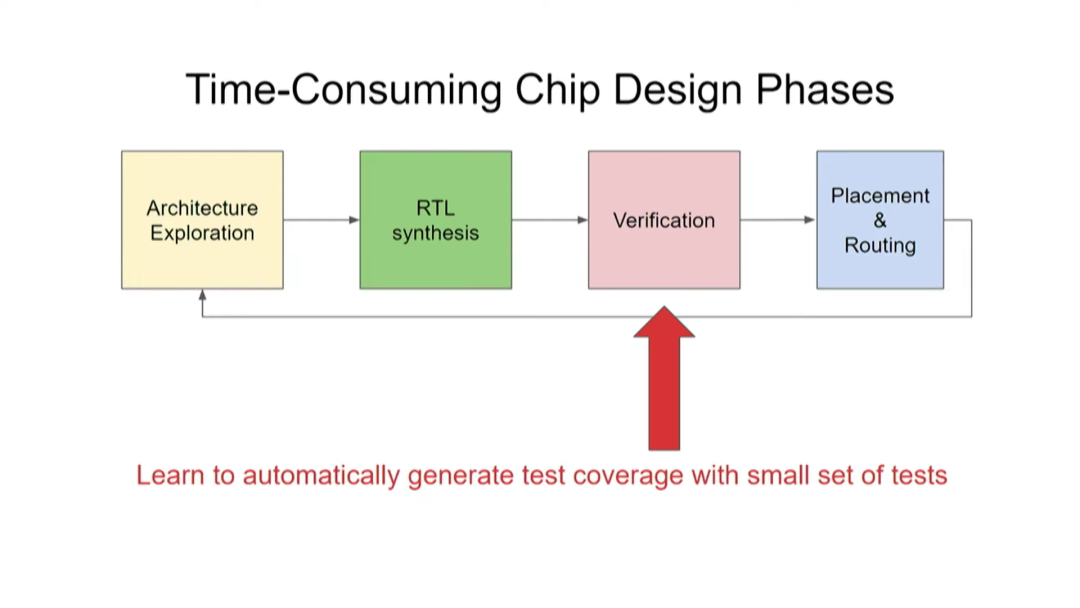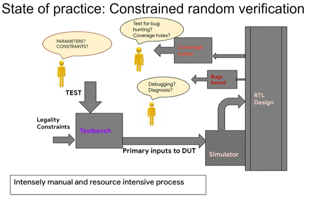 接下来是芯片设计的验证阶段。我们希望用较少的测试次数覆盖多个测试项目。验证是阻碍芯片设计提速的主要瓶颈。据估计,芯片设计过程中,80%的工作量在于验证,而设计本身仅占20%。因此,验证技术的任何一点进步都会产生重大作用。