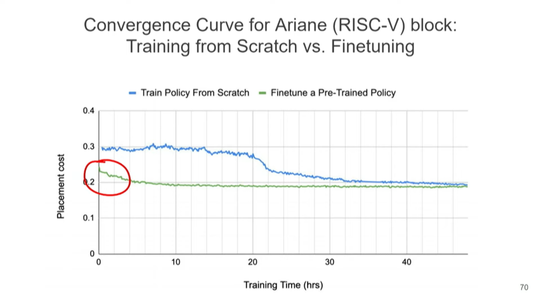 最令我感到兴奋的是圈红部分。调优预训练策略在短时间内就可实现相当不错的布局,这种实现就是我所说的,在一两秒内完成芯片设计的布局。