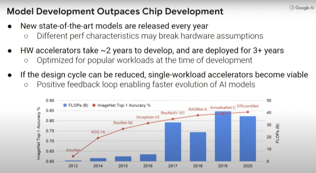 但问题是,如果你在2016年想要尝试设计一个机器学习加速器,那么你需要两年时间来设计芯片,而设计出来的芯片三年后就会被淘汰。你在2016年做的决定将会影响计算,要保证在2018年-2021年高效运行,这真的很难。比如在2016年推出了Inception-v3模型,但此后计算机视觉模型又有四方面的大改进。