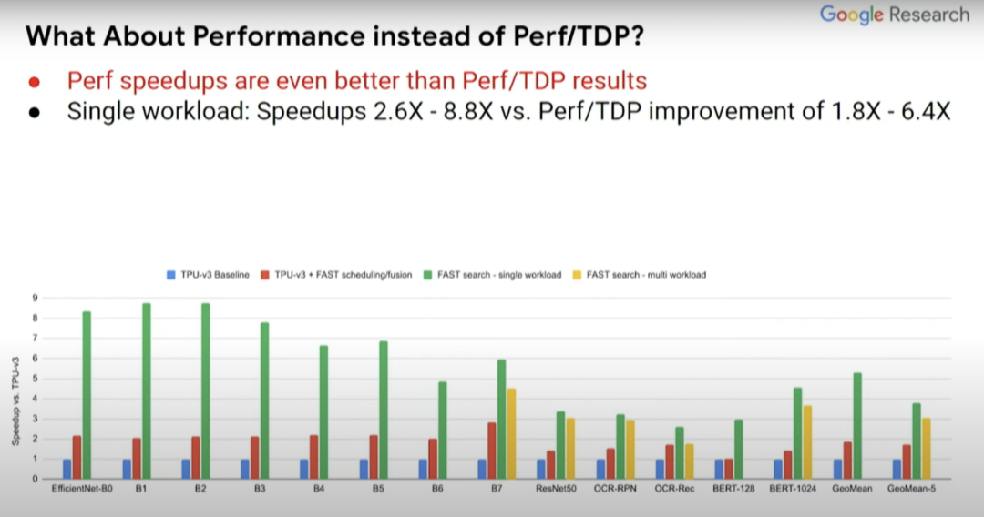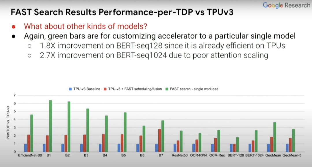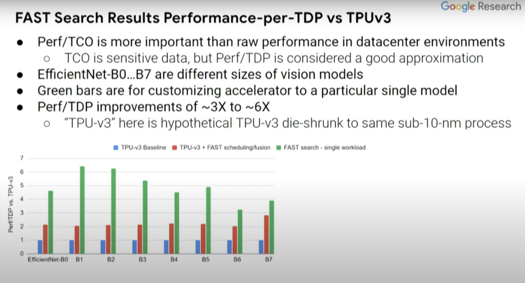 红条和蓝条表示的内容是一致的,但一些探索过的编译器优化不一定在蓝条中得以体现,而这里的绿条则表示的是为单一计算机视觉模型定制的假定型设计。EfficientNet-B0...B7表示相关但规模不同的计算机视觉模型。与蓝条baseline相比,(绿条的)Perf/TDP的改进大约在3到6倍之间。