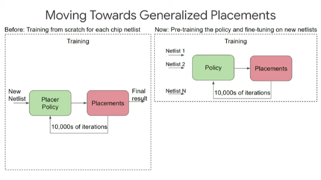 为了实现这个目标,首先,我们运用强化学习算法优化某个芯片设计块的布局,期间需要经历上万次迭代;然后,重复前一步骤,在多个不同的设计块上预训练出一套布局规则,最终让算法在面对前所未见的新设计块时也能给出布局方案。