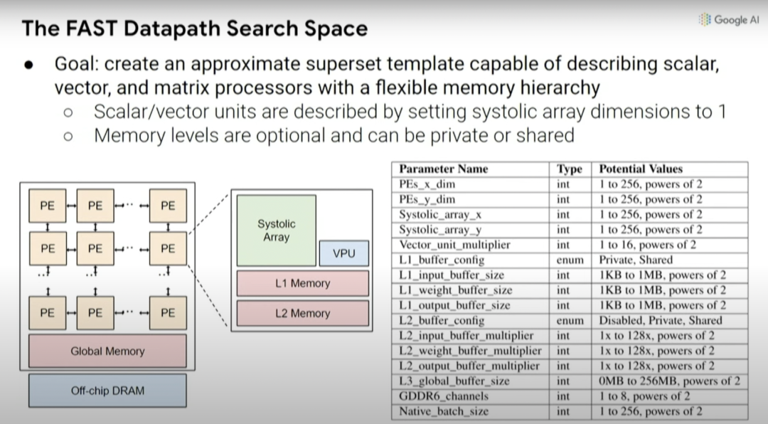根本上说,我们在机器学习加速器中可能做出的设计决策创建了一种更高级别的元搜索空间,因此,可以探索乘法的脉冲列阵(systolic array)在一维或二维情况下的大小,以及不同的缓存大小等等。