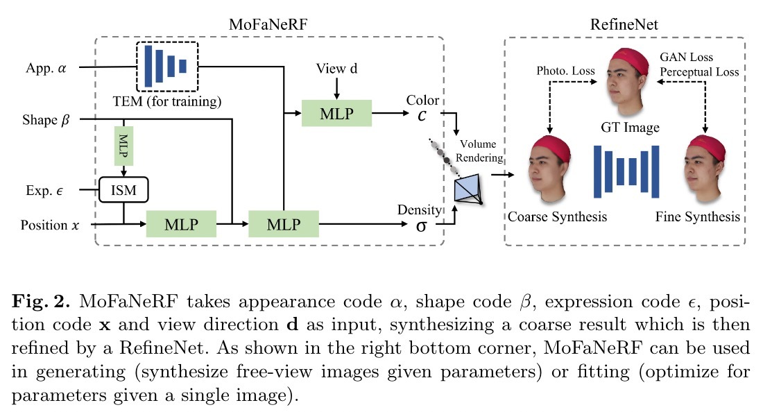 我们提出了一个参数化模型,将自由视角图像映射到一个带有神经辐射场的编码面部形状、表情和外观的向量空间,即可变形面部神经网络。具体来说,MoFaNeRF将编码后的人脸形状、表情和外观以及空间坐标和视图方向作为MLP的输入,输出空间点的辐射亮度进行真实感图像合成。与传统的三维可变形模型(3DMM)相比,MoFaNeRF在直接合成眼睛、嘴巴和胡须的真实感面部细节方面表现出了优越性。同时,通过对输入的形状、表情和外观代码进行插值,可以很容易地实现连续的人脸变形。通过引入身份特定调制和纹理编码器,我们的模型合成了精确的光度细节,显示出强大的表征能力。该模型在基于图像的拟合、随机生成、人脸操纵、人脸编辑和新视图合成等多种应用中显示出强大的能力。实验表明,该方法比已有的参数模型具有更高的表示能力,并在多个应用中取得了较好的性能。据我们所知,我们的工作是第一个建立在神经辐射场上的面部参数化模型,可以用于拟合、生成和操作。