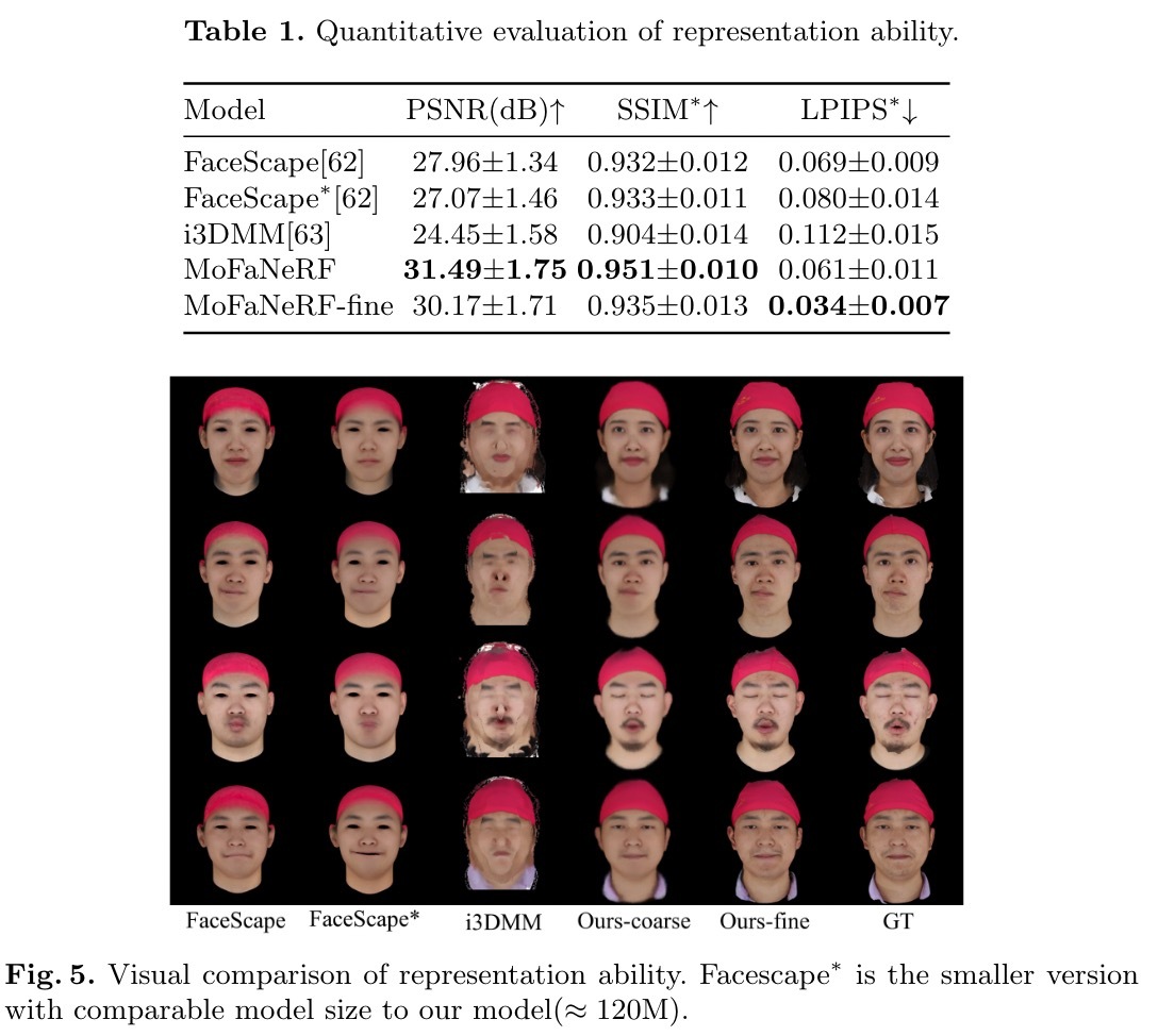 我们首先将模型与以往的参数模型在表征能力上进行了比较,然后说明了参数解纠缠和网络设计在烧蚀研究中的有效性。最后,我们评估了MoFaNeRF在基于单视图的图像拟合、视图外推和人脸处理方面的性能。