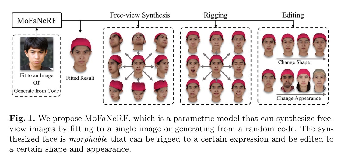 - 根据我们所知,我们提出了第一个参数化模型,该模型利用神经辐射场将自由视点人脸图像映射到向量空间,并且与传统的三维可变形模型无关。