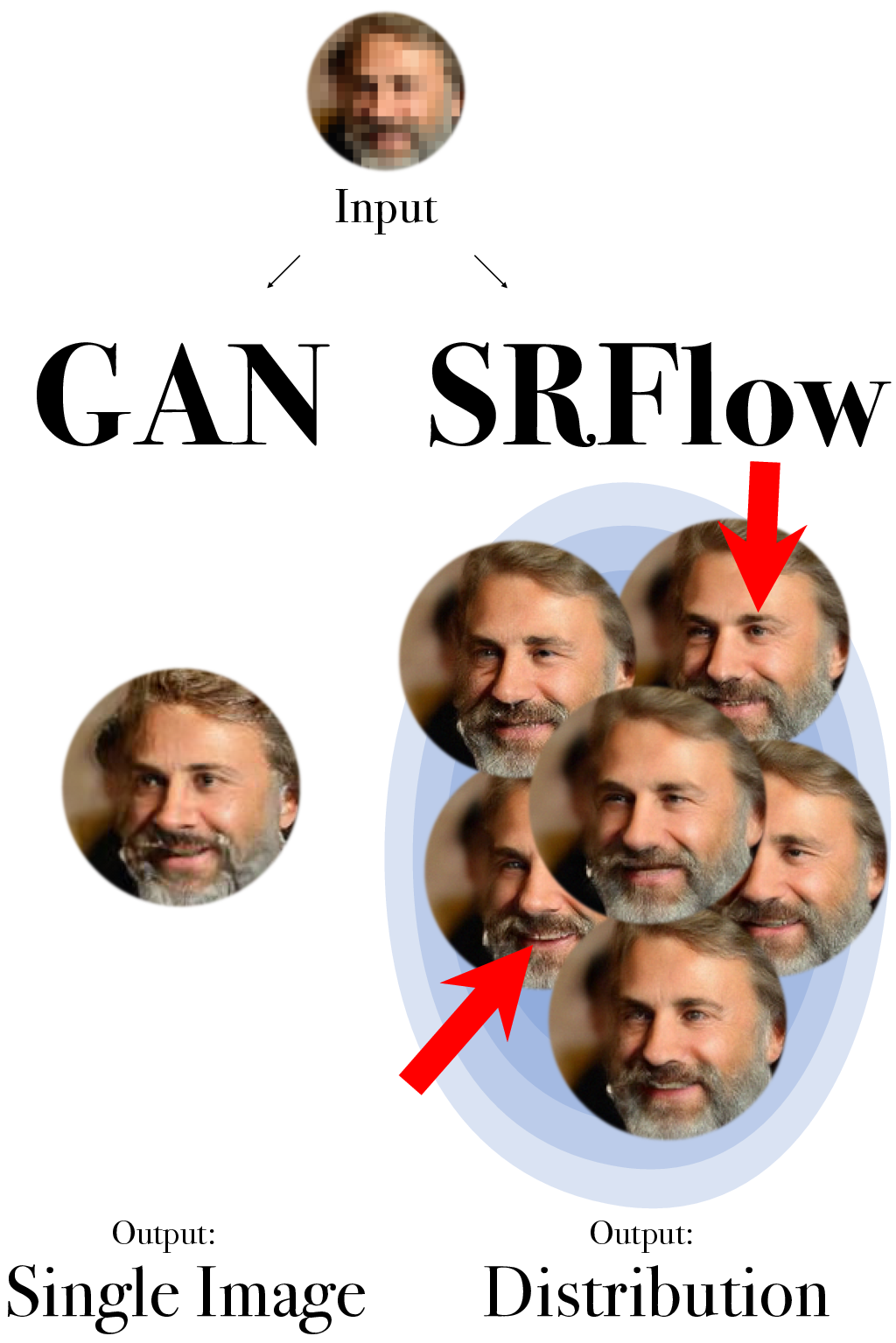 超分辨率是一个不适定问题(ill-posed problem),它允许对给定的低分辨率图像做出多种预测。这一基础事实很大程度上被很多当前最优的深度学习方法所忽略,这些方法将重建和对抗损失结合起来,训练确定性映射(deterministic mapping)。