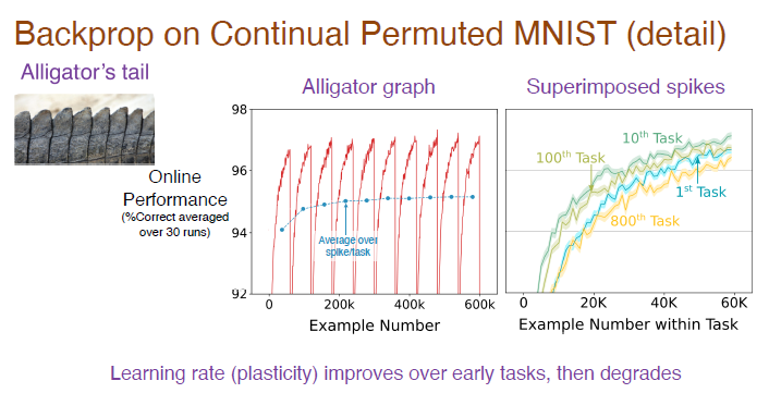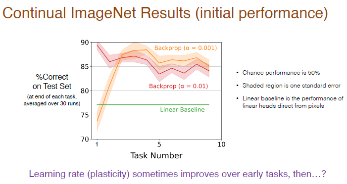因此,对于良好的超参数,任务间的可塑性会衰减,准确率会比只使用一层神经网络还要低,红色曲线所显示的几乎就是“灾难性的可塑性缺失”。