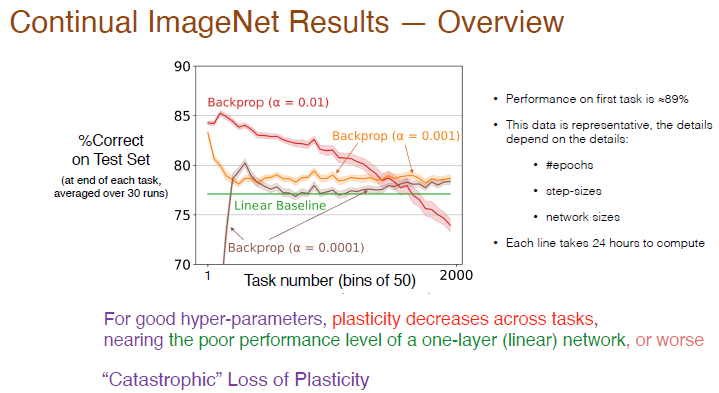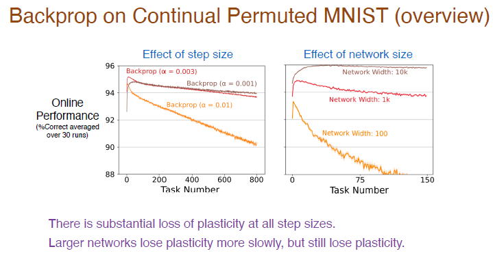 Richard Sutton 首先从数据集的角度证明了可塑性损失的存在,然后从神经网络内部分析了可塑性损失的原因,最后提出持续反向传播算法作为解决可塑性损失的途径:重新初始化一小部分效用度较低的神经元,这种多样性的持续注入可以无限期地保持深度网络的可塑性。