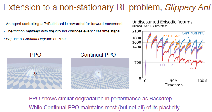 图注:PPO 算法在刚开始表现还不错,但随着训练进行性能不断下降,引入 L2 算法以及收缩和扰动算法后会有所缓解。而持续 PPO 算法的表现相对较好,保留了大部分可塑性。